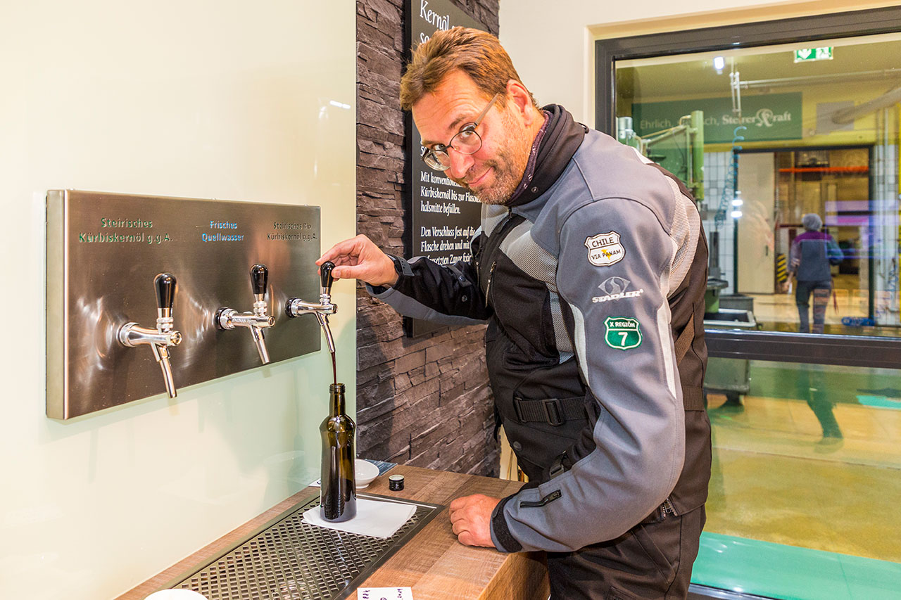 Das Highlight der Steirerkraft-Kernothek in Wollsdorf ist die Kürbiskernöl-Schank: Wo sonst kann man das „Grüne Gold“ der Steiermark selbst zapfen? Die Flaschenetiketten werden individuell beschriftet. Kürbiskernöl eignet sich nicht nur zum Würzen von Salat, sondern kann auch – pssst, Geheimtipp – den Geschmack von Vanilleeis einzigartig verfeinern. Führungen durch die Ölmühle stehen ebenso im Angebot wie weitere regionale Produkte im stylishen Shop.
