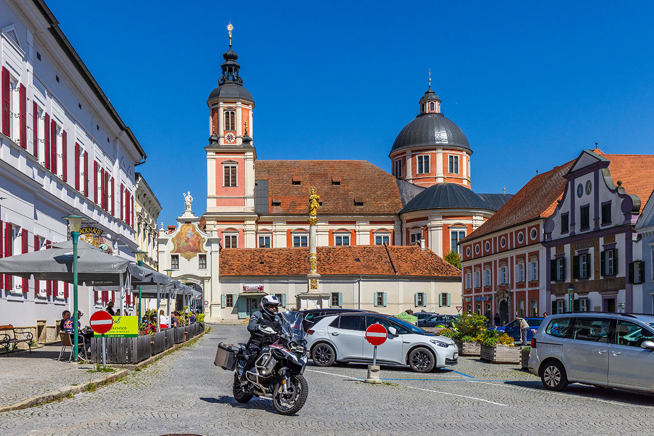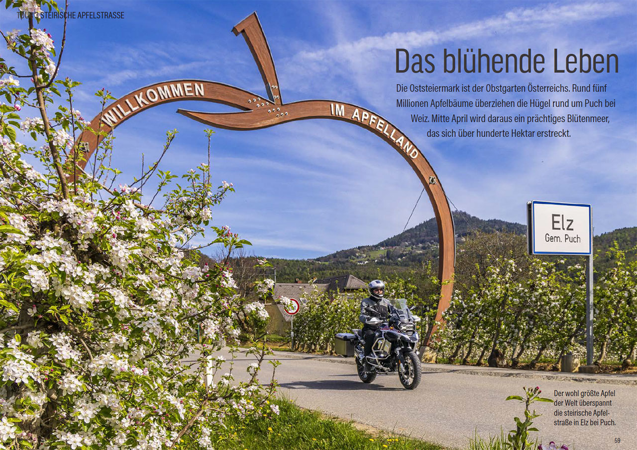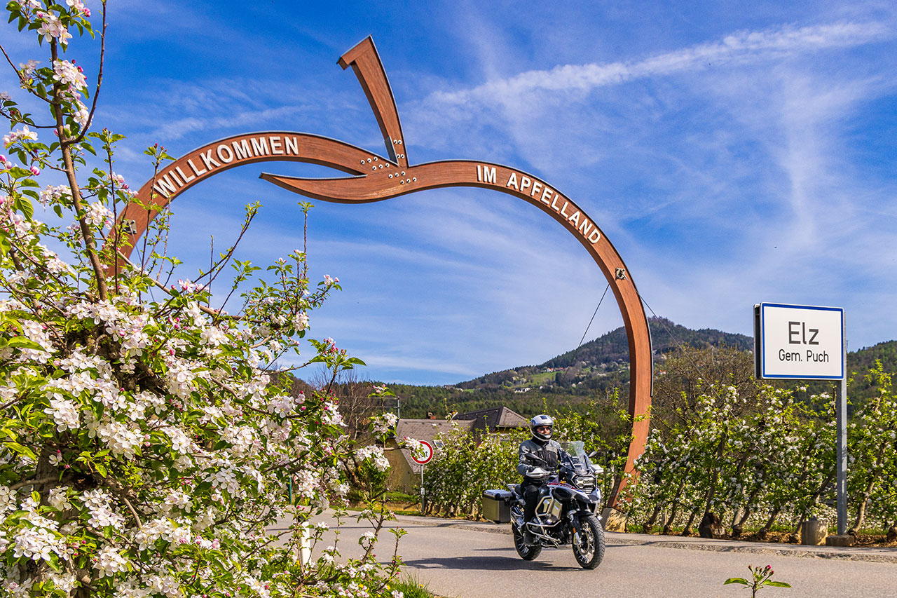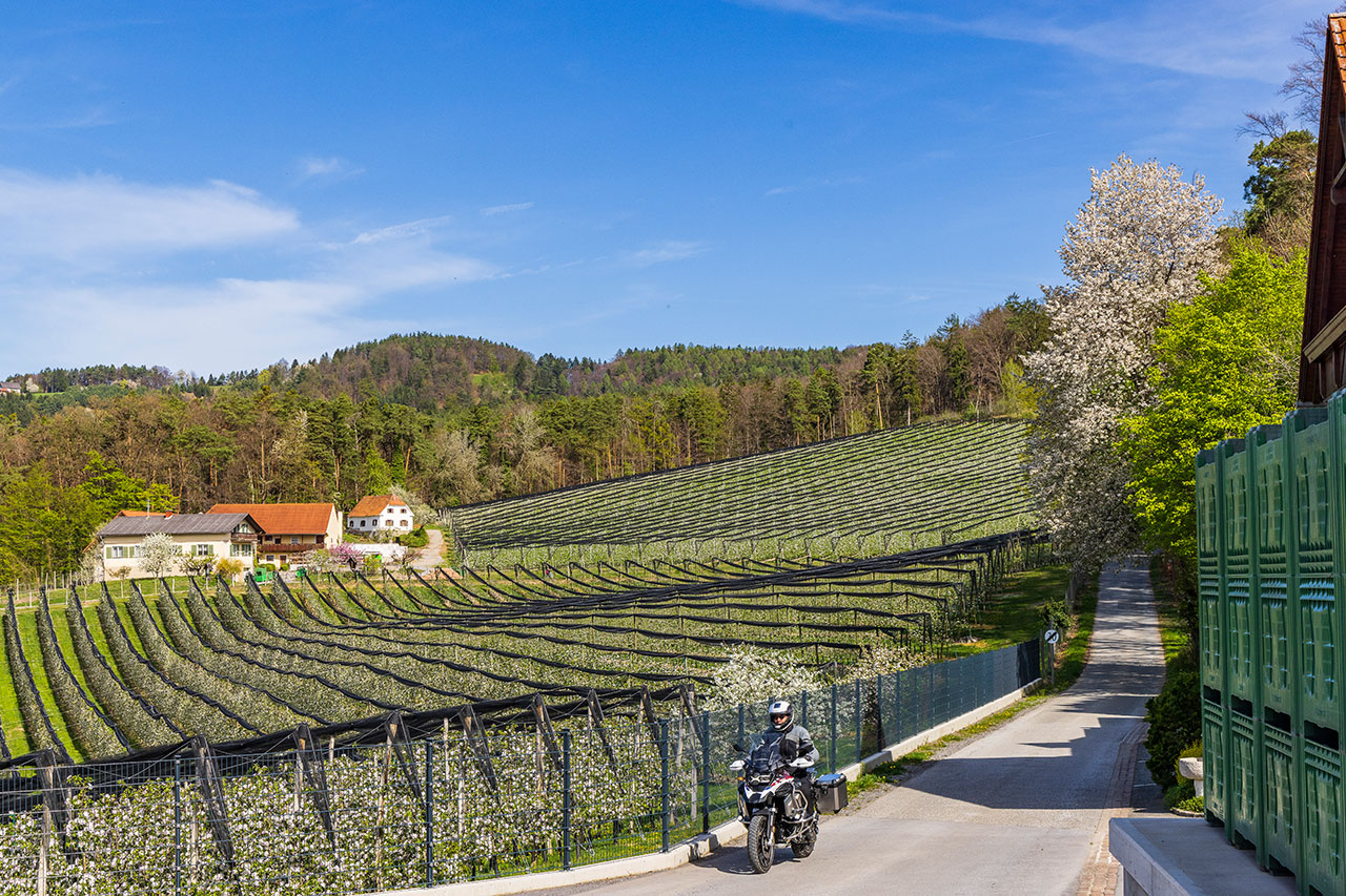 Während sich das bestens erhaltene historische Stadtzentrum Hartbergs im warmen Licht der Frühlingssonne mit Leben füllt, klappen wir den Seitenständer ein und starten unsere Rundfahrt durch den Obstgarten Österreichs. Er blüht im Versteckten, eingezwängt zwischen der Südautobahn und der Schnellstraße durch das Mur- und Mürztal. Zwei Hauptachsen, auf denen eilige Verkehrsteilnehmer sowie der Schwerverkehr dem Süden zustreben. Gäste, die mit dem Motorrad anreisen, sind (noch) selten, denn die Oststeiermark ist selbst für viele Österreicherinnen und Österreicher eine unbekannte Gegend – zu Unrecht, wie wir meinen. Sie verpassen landschaftliche Idylle und nahezu ungetrübte Ruhe im untergeordneten Straßennetz – ein kleines Paradies, aus dem man jedoch beim ersten Fruchtgenuss nicht umgehend von einem Erzengel mit dem flammenden Schwert vor die Türe gesetzt wird.