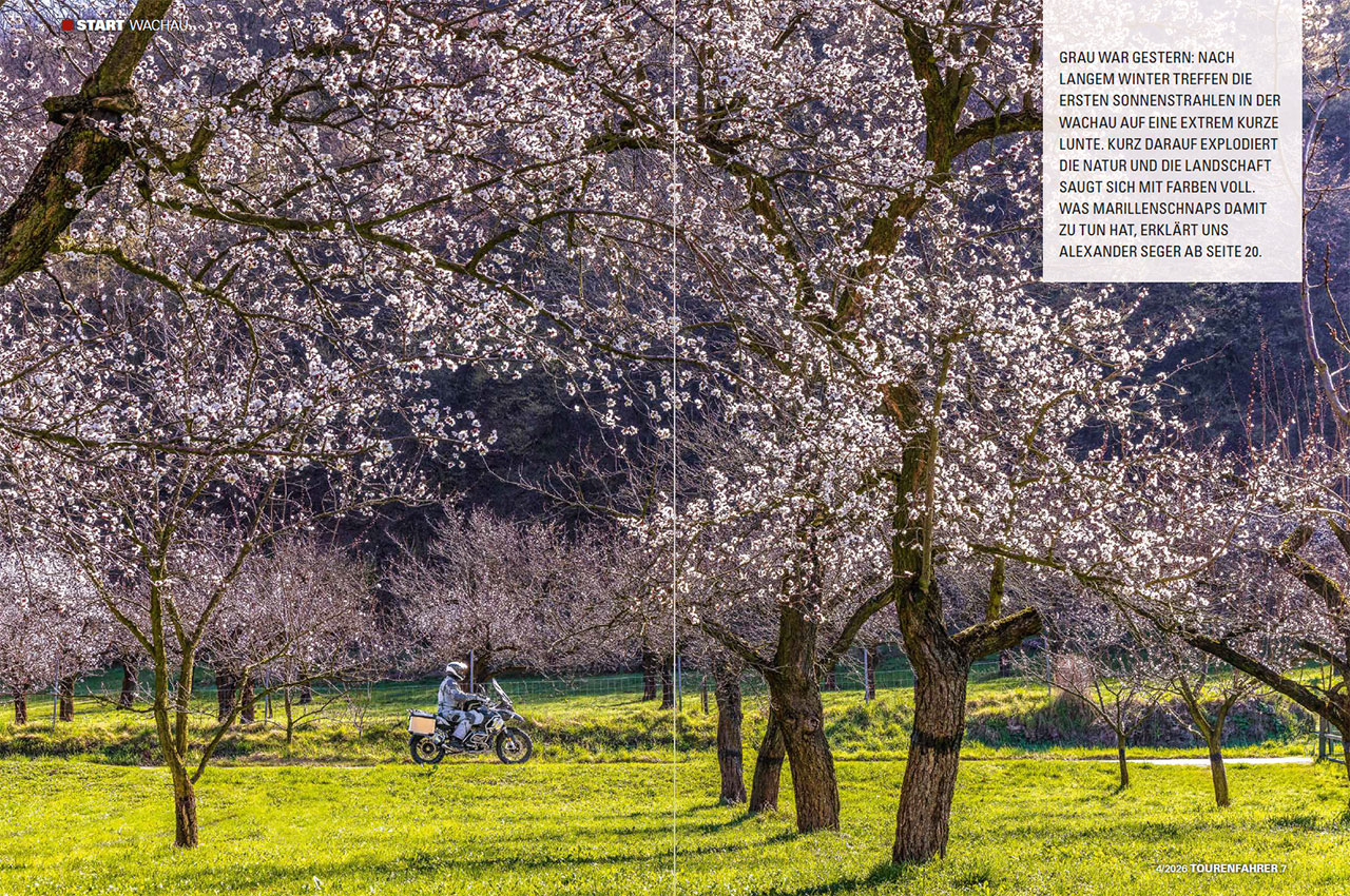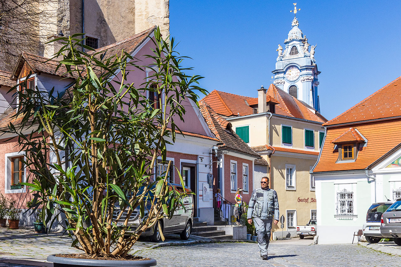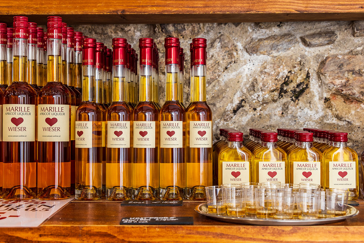 Rund um die Stiftskirche mit ihrem blau-weißen Turm, der als eines der kulturhistorischen Wahrzeichen der Wachau gilt, liegt die verwinkelte, von einem mittelalterlichen Mauerring umgebene Altstadt Dürnsteins. Sie ist im Hochsommer von Bustouristen, Gästen von Donau-Kreuzfahrtschiffen und in grelle Funktionskleidung gepressten Radfahr-Urlaubern überfüllt, bei meinem Besuch Mitte März hingegen nahezu ausgestorben. Der Laden für Wachauer Safran ist noch auf Winterurlaub, aber einzelne Andenken-Shops harren bereits der Laufkundschaft. In den Regalen finden wir haltbare Produkte der Wachauer Leitfrucht, der Marille (jenseits des Weißwurst-Äquators als Aprikose bekannt): Schnaps, Likör und (in Österreich beharrlich als Marmelade titulierte) Konfitüre gibt es das ganze Jahr. Reife Früchte werden nur während der sommerlichen Erntezeit direkt in den Marillengärten verkauft, täglich in Handarbeit frisch vom Baum gepflückt.