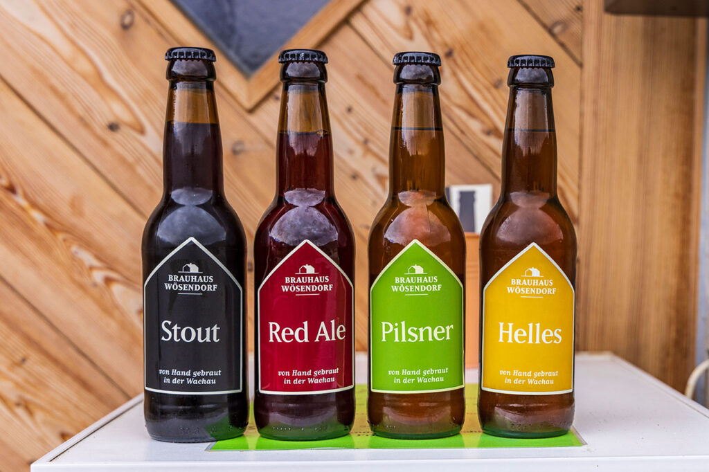 Während der Wachauer Safran in Dürnstein nur zu ausgewählten Zeiten (oder online) gekauft werden kann, ist Wachauer Chili rund ums Jahr erhältlich: Manuela und Stefan Hick kultivieren in ihrer Gärtnerei am Fuß der Seiberer-Straße über 100 Pfefferoni-Sorten und mahlen aus den Schoten Mischungen, deren Schärfe von würzig bis waffenscheinpflichtig reicht. Ein weiteres Kuriosum mitten im Herzen der bekanntesten Weinbauregion Österreichs entdecke ich in Wösendorf: Eine kleine Privatbrauerei, die ihre Pforten nur nach telefonischer Voranmeldung öffnet, für durstige Wandersleut’ oder Radfahrende aber einen gut sortierten Kühlschrank mit „ehrlicher Kasse“ bereithält.
